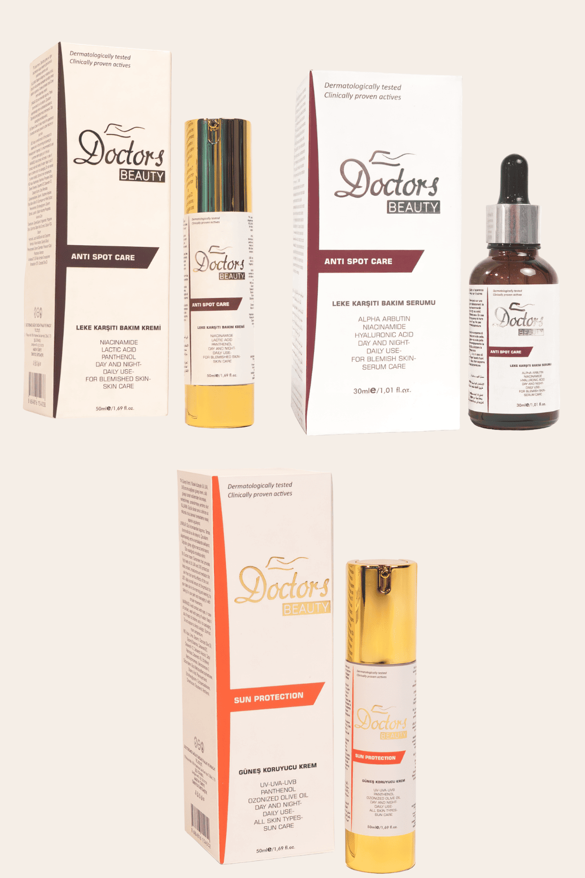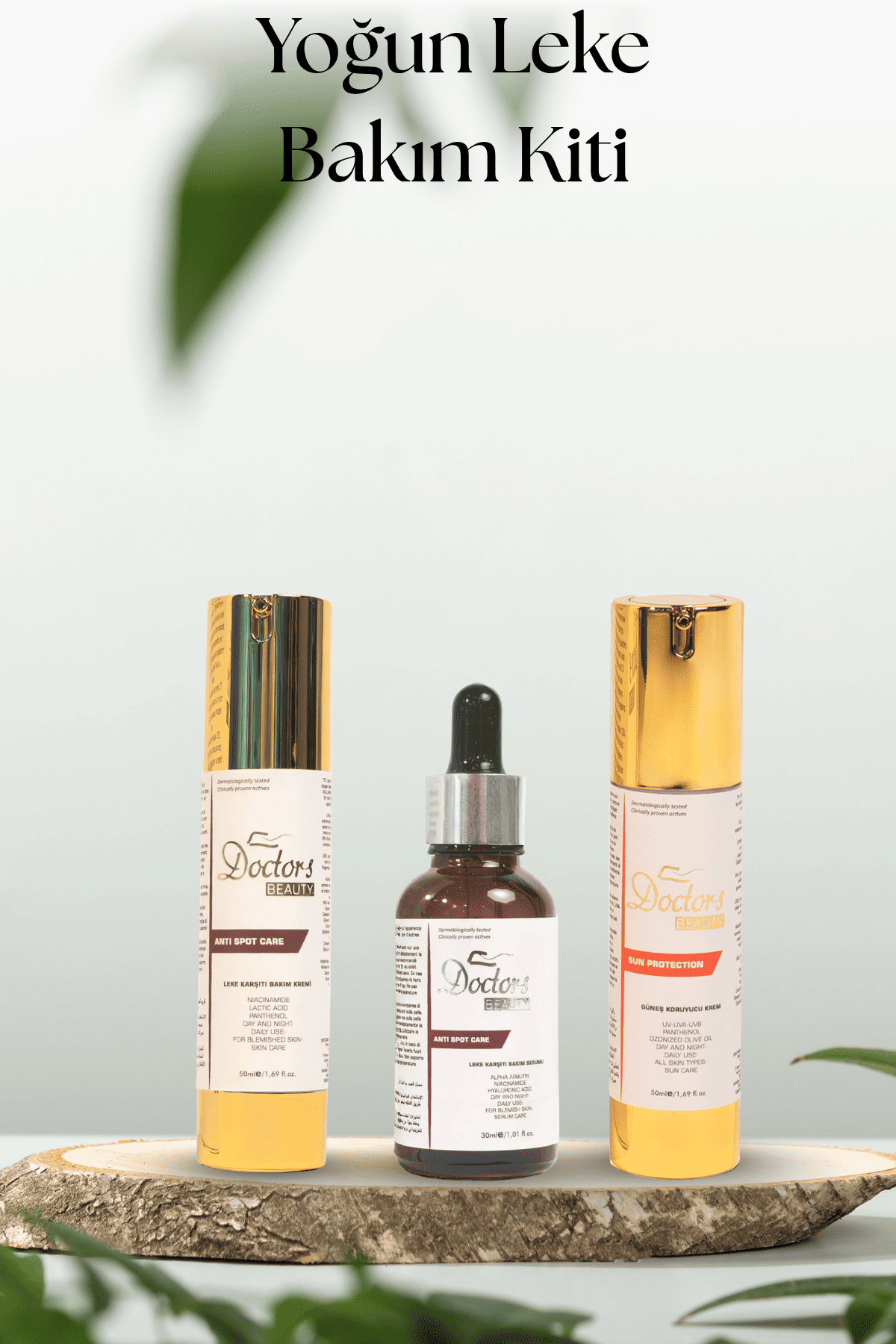 Lekelerin cildinizin ışıltısını gölgelemesine izin vermeyin. Doctors Beauty 3 Adımlı Komple Leke Karşıtı Bakım Seti ile tek ton, aydınlık ve pürüzsüz bir cilde kavuşun!
